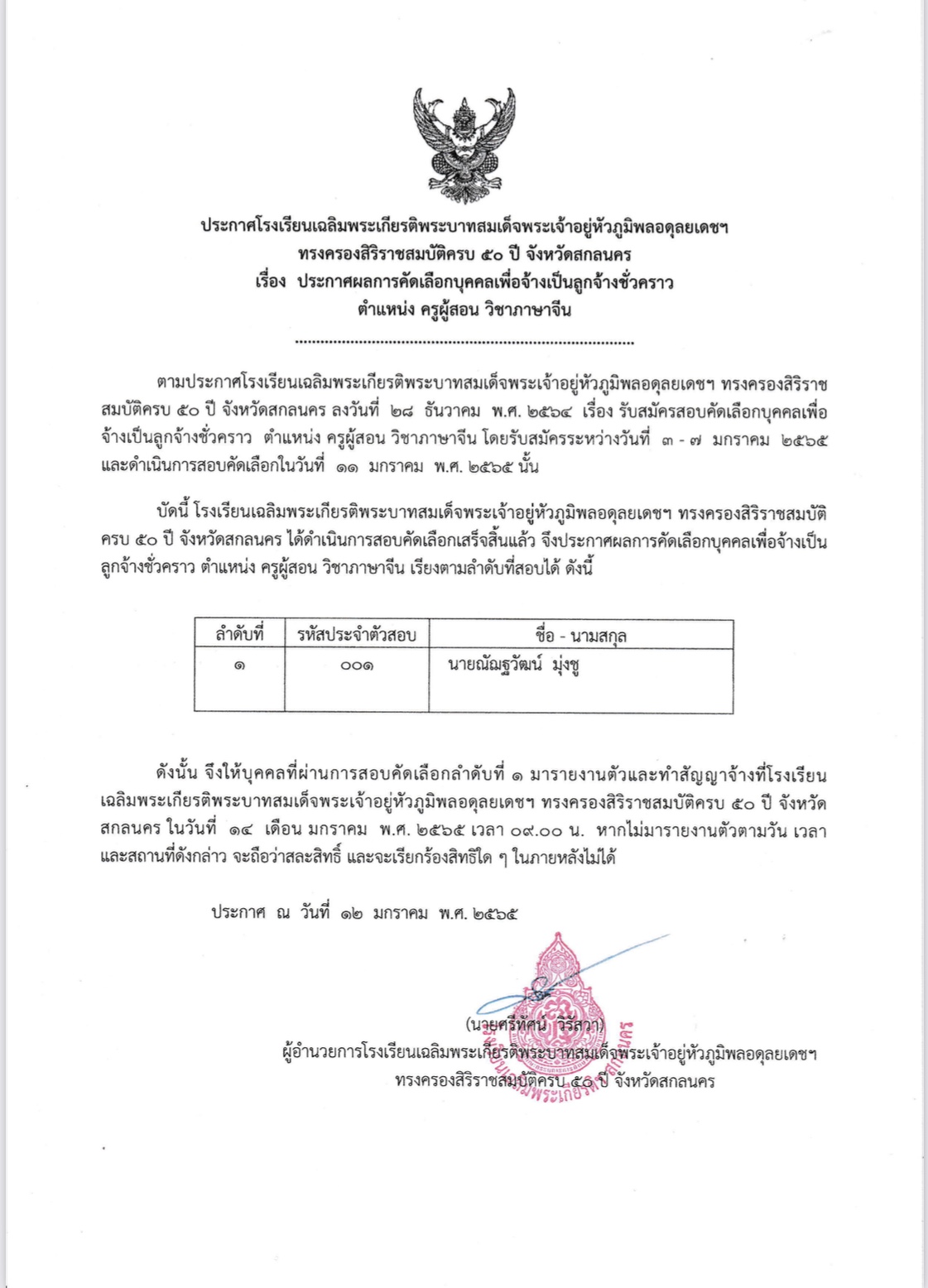 ประกาศผลการคัดเลือกครูผู้สอนวิชาภาษาจีน